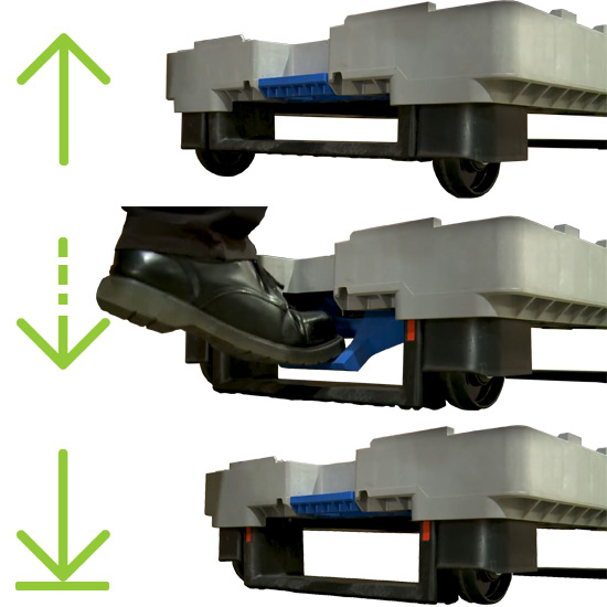 - Easy To Use: Foot operated lever lowers and raises the pallet runners, allowing quick changes between stationary and mobility modes